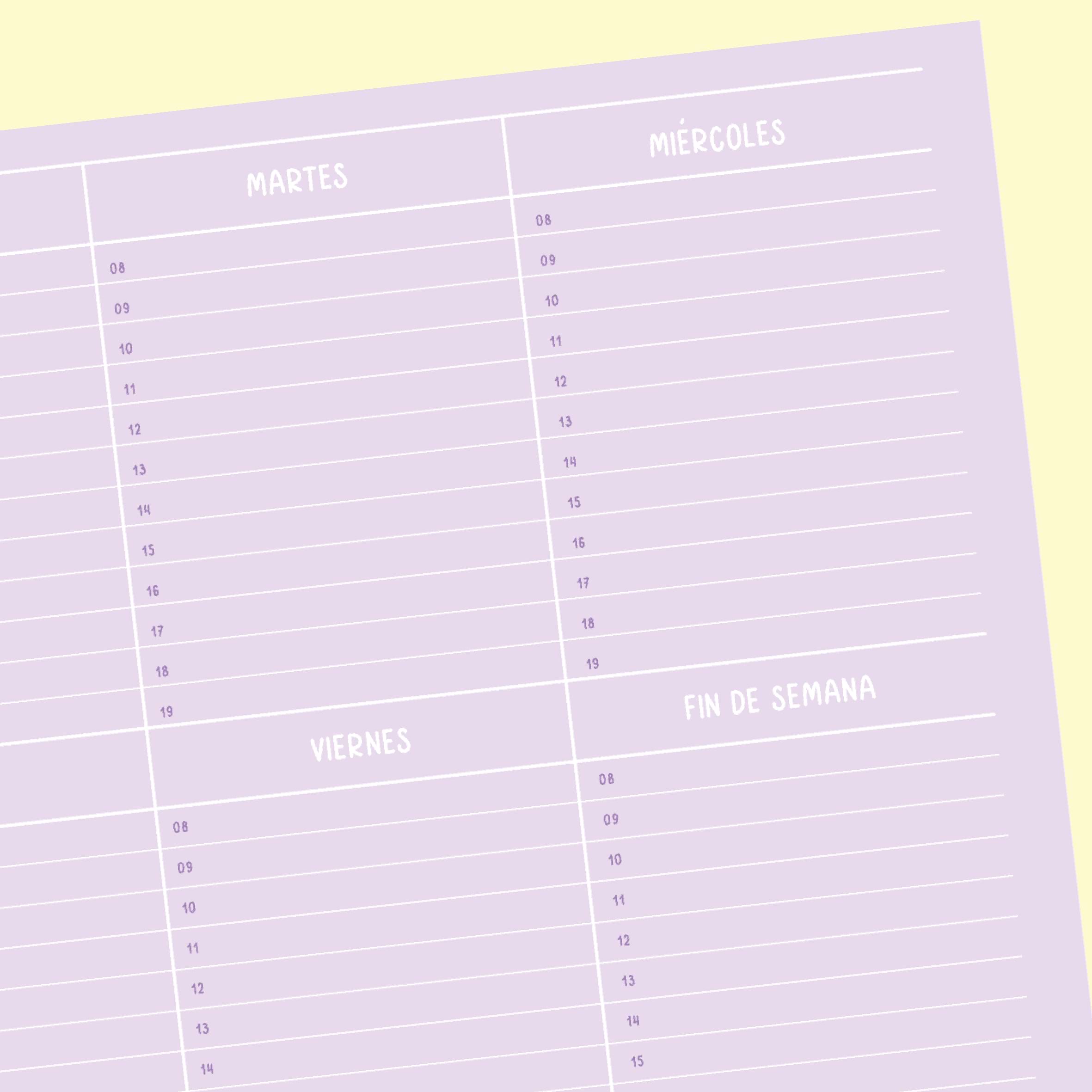 Planificador semanal amplio con horarios, tareas de la semana en curso y pendientes de la próxima.