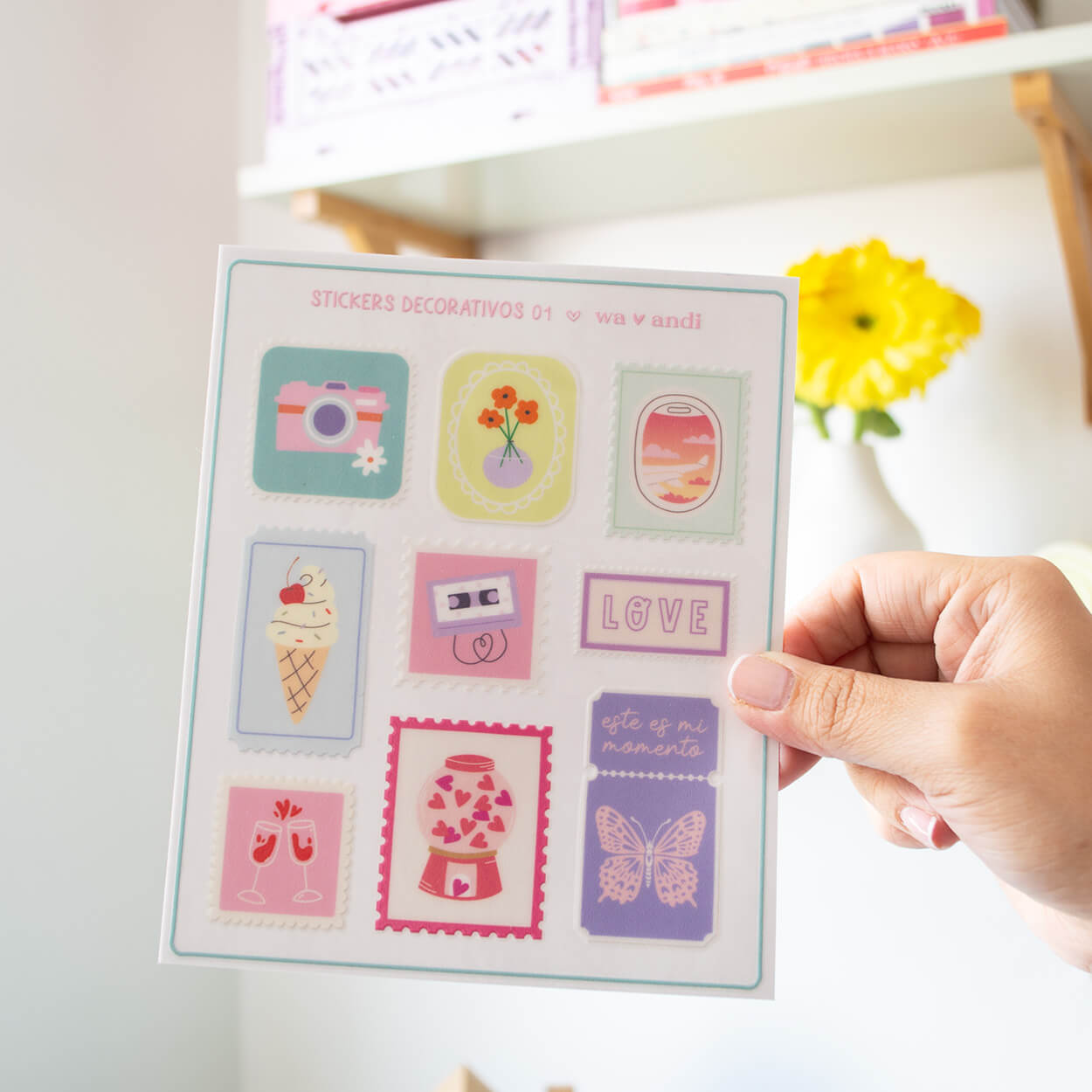 Nuestros stickers plásticos están diseñados para acompañarte en tu día a día y darle vida a todo lo que uses. Puedes aplicarlos en cualquier superficie lisa como botellones, espejos, tazas, cuadernos y más 💖