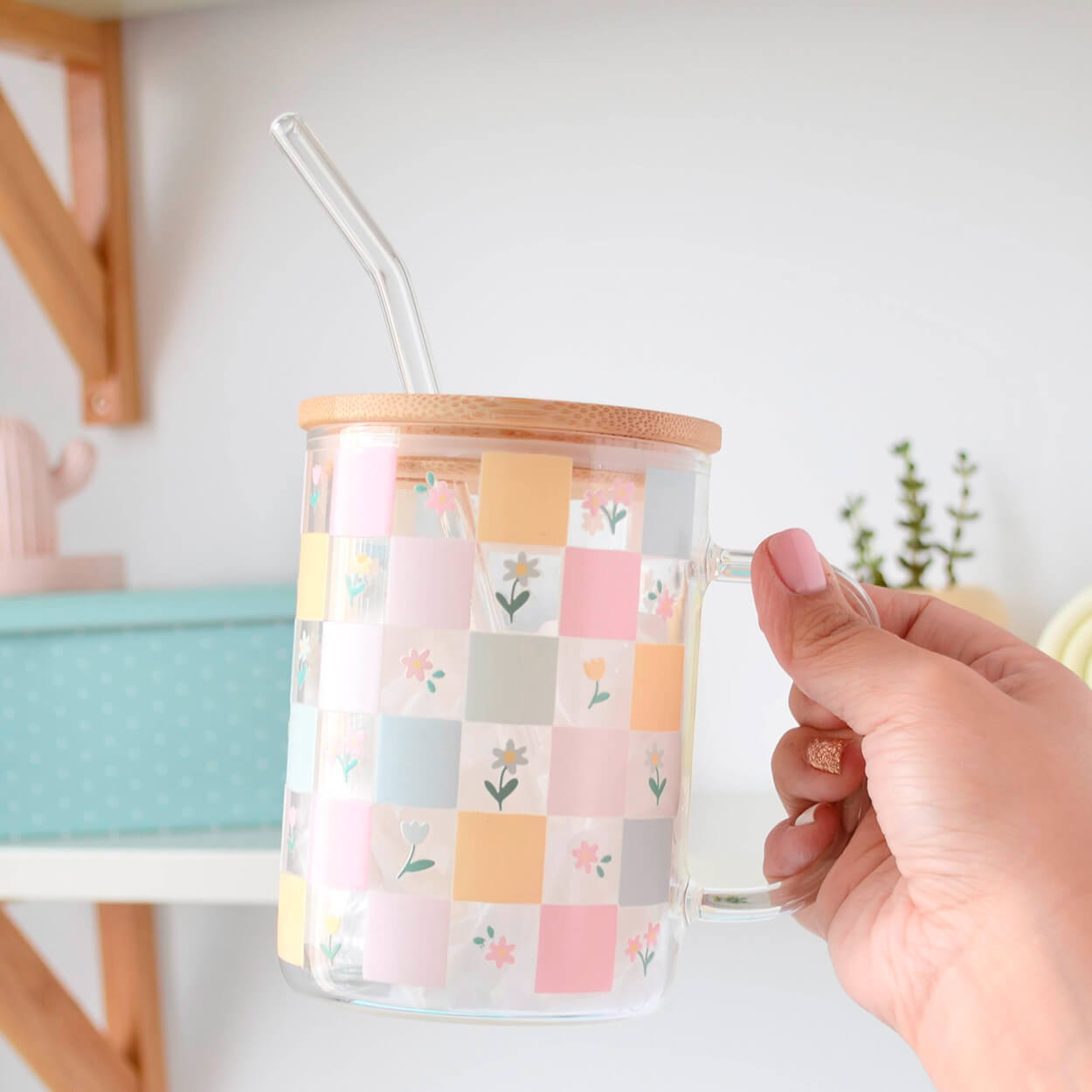 Taza de cristal con tapa de bambú.